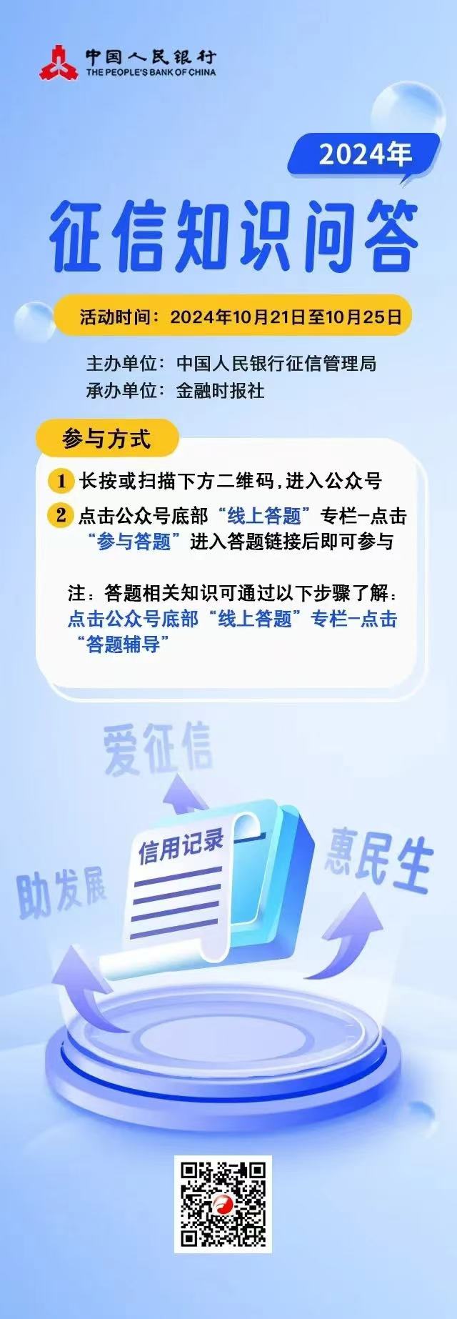 为广泛宣传群众关心、与群众切身利益相关的征信知识,引导群众了解征信、运用征信,正确维护自身征信合法权益,切身提升全社会对“征信为民、助力发展”的认识,营造征信高质量发展的良好社会氛围,2024年10月21-25日中国人民银行征信管理局会同金融时报社将在全国开展“征信知识线上答题”活动,欢迎大家踊跃参与!