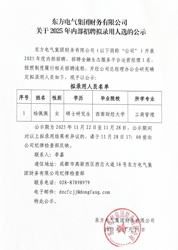 壹号娱乐官网集团财务有限公司关于2025年内部招聘拟录用人选的公示